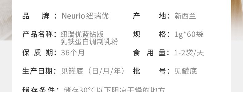 商品名称:纽瑞优(NEURIO)乳铁蛋白蓝钻版60g