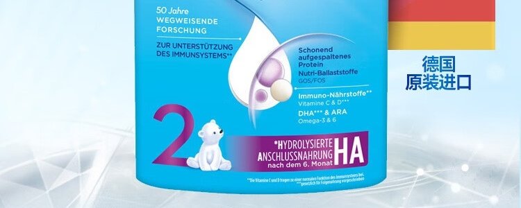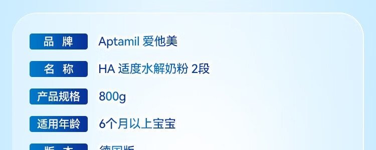 商品名称:保税区德国 爱他美(Aptamil)HA免敏奶粉2段 800g 适合6个月以上