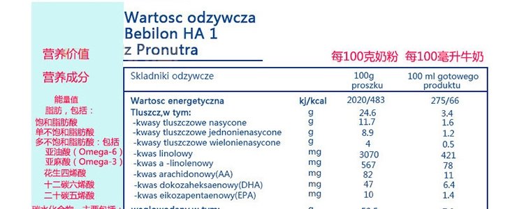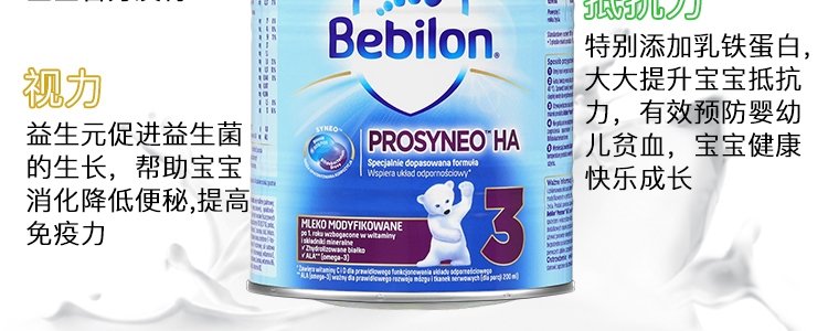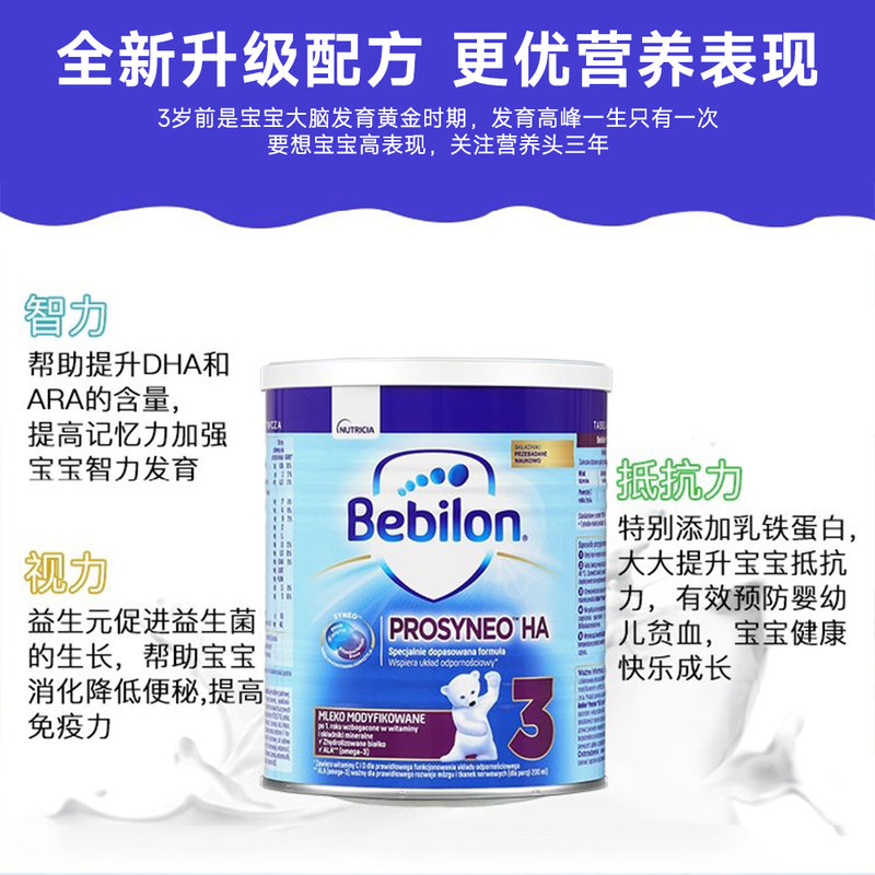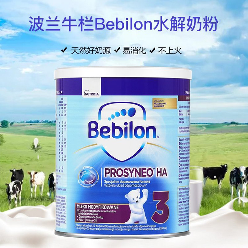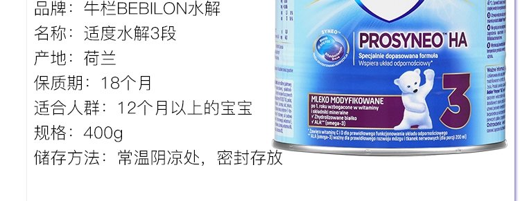 商品名称:保税区波兰 牛栏(Bebilon)HA半水解奶粉3段 400g 适合1岁+