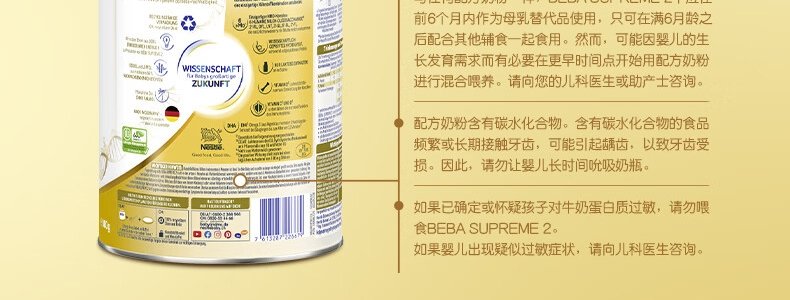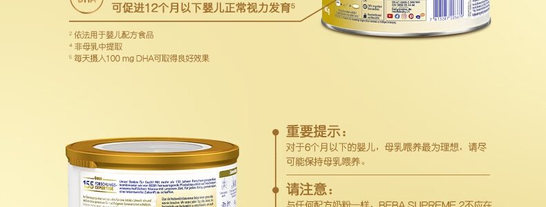 商品名称:保税区德国 雀巢(Nestle)BEBA SUPREME婴幼儿奶粉 2段 800g 适合6-12个月(新旧包装随机发货)
