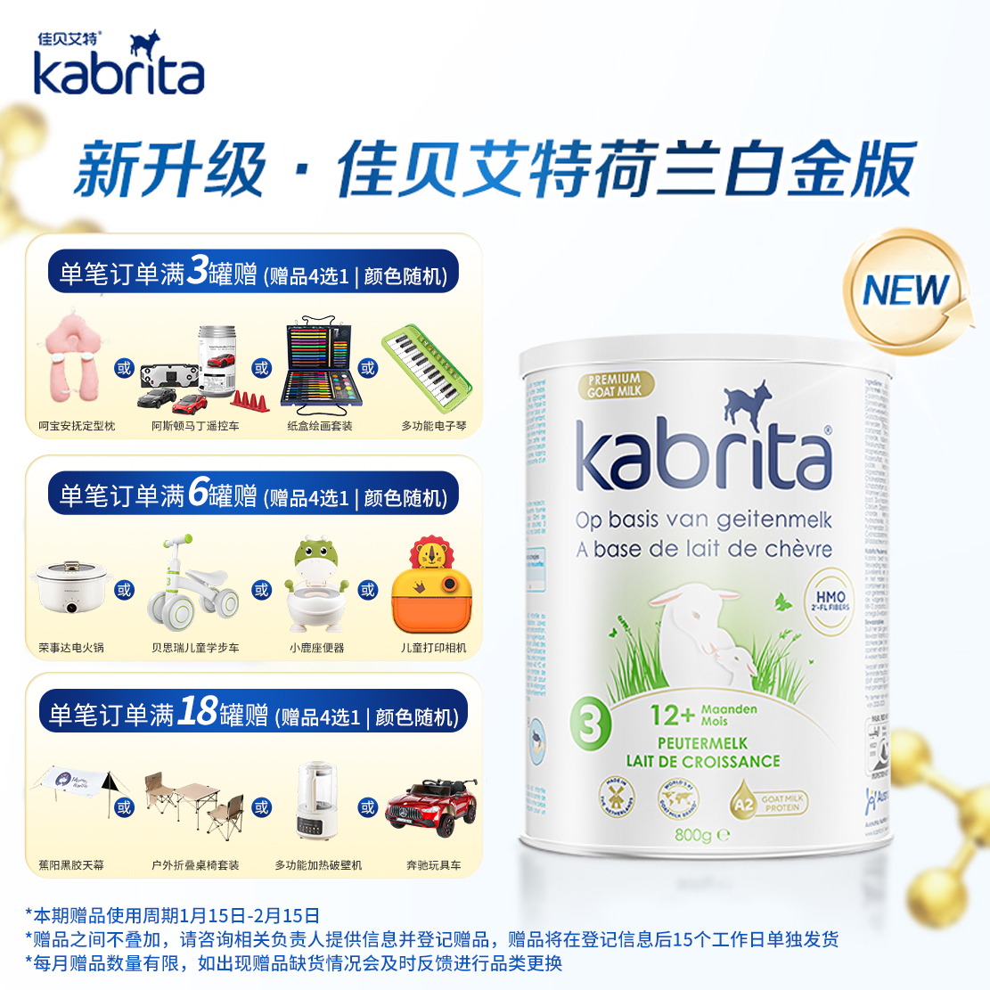 保税区荷兰 佳贝艾特(Kabrita)金装婴幼儿羊奶粉3段800g(新包装)适合1岁以上