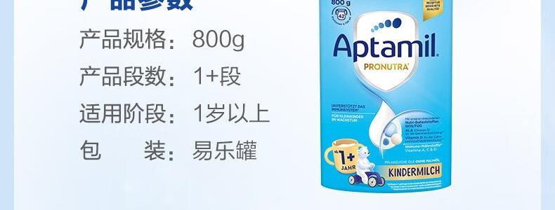 商品名称:保税区德国 爱他美(Aptamil)婴儿配方奶粉易乐罐蓝罐 800g 1+段 适合1岁以上
