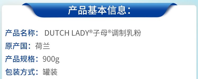商品名称:保税区荷兰 子母(DUTCH LADY)全脂奶粉 900g(港版)