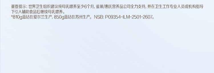商品名称:惠氏 (Wyeth)启赋蓝钻较大婴儿配方奶粉2段 850g 新国标 适合6-12个月*无积分【保证正品】